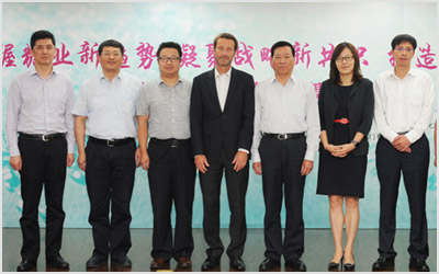 战略论坛主要领导及嘉宾合影,光明集团董事长吕永杰(右四),光明集团副总裁、上海糖酒董事长葛俊杰(左二),上海糖酒总裁崔智均(右一),众博在线创始人孙彤(左三),路易达孚全球糖业总监Jacques Gillaux(左四)