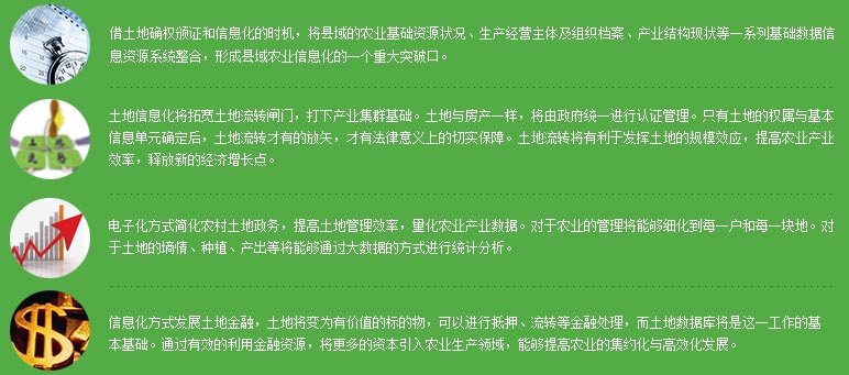 国家推动的土地确权登记,如同90年代的商品房改革,这次通过确权登记确立了农民的财产权,是本次农业改革的灵魂,也将彻底激活农业经济的发展,使其成为带动中国经济增长的新亮点!通过土地确权登记,完成土地信息化,这是农业信息化的第一步,接着通过众博(中国)应用平台建设,有效地把县域农业生产要素和信息整合起来,形成一个对外的接口,这样才能高效融入互联网行业的发展,利用互联网思维改造当地农业,加速推进县域农业产业集群的发展,增强县域经济的核心竞争力!
